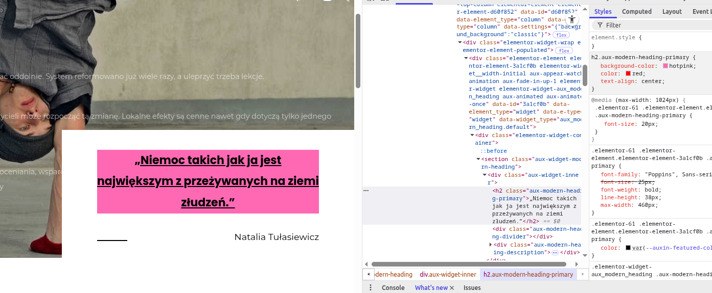 </html>Używając narzędzi developerskich w przeglądarce (DevTools – F12 lub RMB > „Zbadaj”) zmodyfikuj lokalnie wygląd skomplikowanej strony (np. opartej na WordPressie). Szczególnie ciekawe będą te elementy strony, które nie mają swojego id, a przypisana klasa jest używana też dla innych elementów, których nie chcesz formatować.